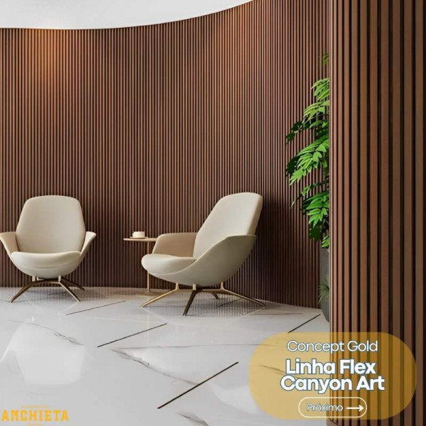 O Painel Ripado modelo Concept da linha Flex Gold na cor Canyon Art da Barreto oferece uma solução versátil e prática, ideal para transformar ambientes. Com seu sistema de encaixe peça por peça, a instalação é rápida e eficiente, evitando disperdícios e um ajuste perfeito usando Dupla Face e Cola PU.