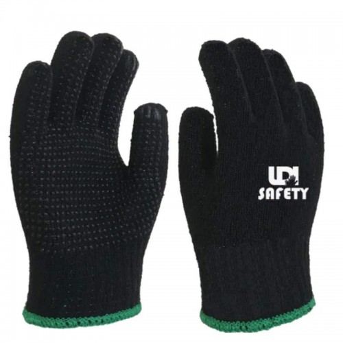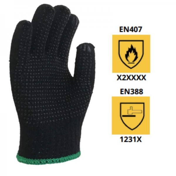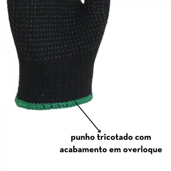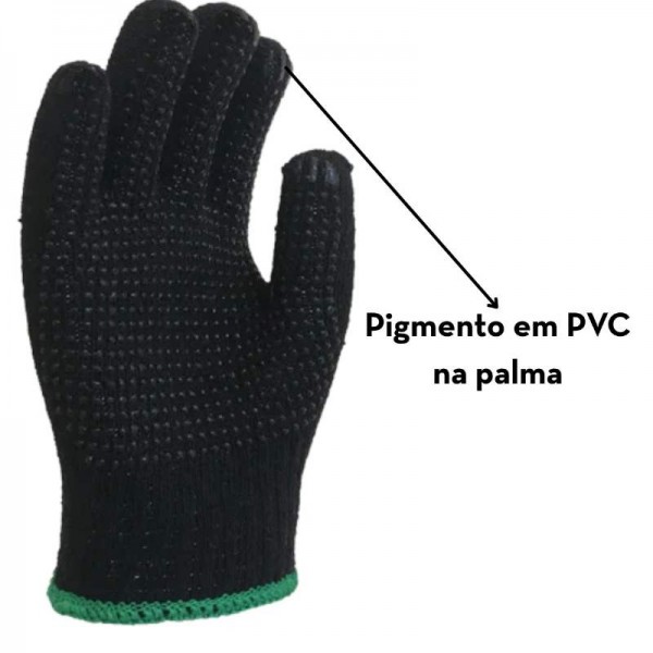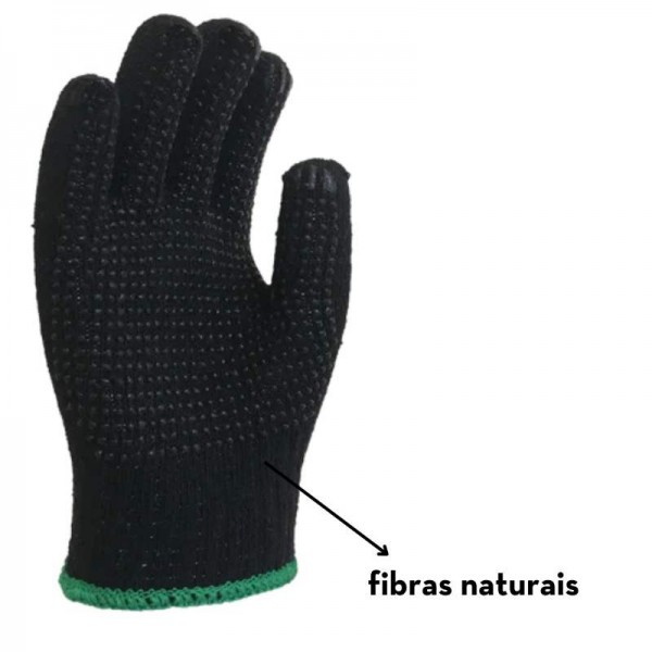 Luva de proteção confeccionada em tecido de fibras naturais na cor preta, com acabamento em overloque. Estrutura em algodão com aplicação de pigmentos em PVC na região da palma, oferecendo excelente aderência e resistência ao atrito em atividades profissionais. Possui punho tricotado, proporcionando ajuste firme e confortável, evitando deslocamentos ou folgas durante o uso. O revestimento interno em fibras naturais colabora para maior conforto e proteção em jornadas prolongadas.