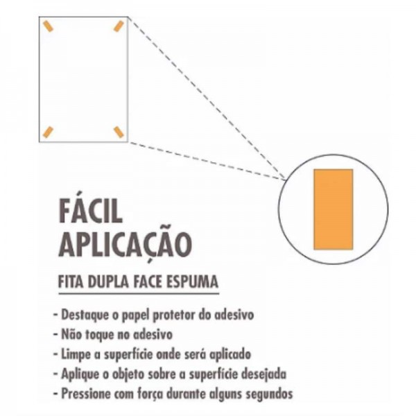 Acompanha fita dupla face autocolante de alta qualidade. Para melhor fixação, limpe a superfície com álcool líquido, aguarde secar, remova o liner da fita, posicione e pressione a placa sobre a superfície lisa.