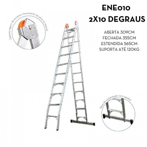 Escada Extensiva 100% alumínio Ágata 2x10 degraus REF. ENE 010