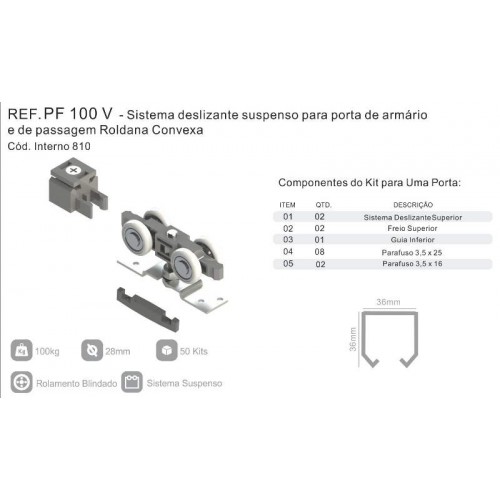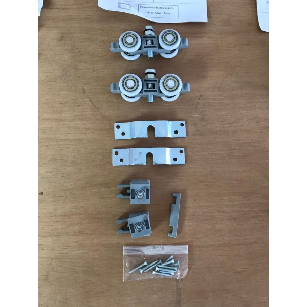 Sistema que permite que você tenha uma porta deslizante para armários e portas de passagem. Contém: - 2 Sistemas Deslizantes Superiores (para portas até 100kg) - 2 Freios Superiores - 1 Guia Inferior - 8 Parafusos 3,5 x 25 - 2 Parafusos 3,5 x 16