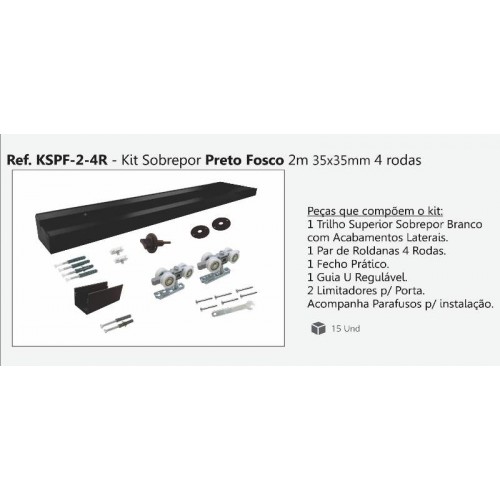 Kit com trilho para porta de sobrepor de correr - 1 Trilho Superior Sobrepor preto com Acabamentos Laterais - 1 Par de Roldanas 4 rodas ou 2 rodas - 1 Fecho Prático - 1 Guia "U" Regulável - 2 Limitadores para Porta - Acompanha Parafusos e Manual para Instalação Obs: não acompanha a porta