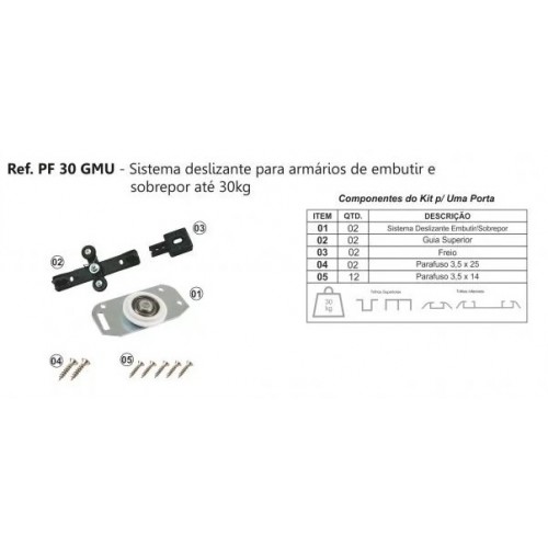 Sistema que permite que você tenha uma porta (de embutir ou sobrepor) deslizante para armários. Contém: - 2 Sistemas Deslizantes Embutir/Sobrepor (para portas de até 30kg) - 2 Guias Superiores - 2 Freios - 2 Parafusos 3,5 x 25 - 12 Parafusos 3,5 x 14