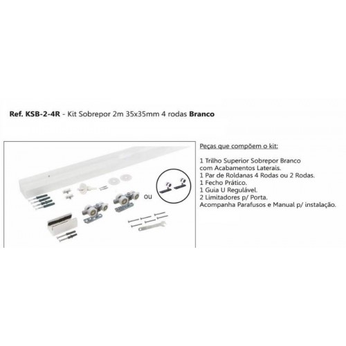 Kit com trilho para porta de sobrepor de correr - 1 Trilho Superior Sobrepor Branco com Acabamentos Laterais - 1 Par de Roldanas 4 rodas ou 2 rodas - 1 Fecho Prático - 1 Guia "U" Regulável - 2 Limitadores para Porta - Acompanha Parafusos e Manual para Instalação Obs: não acompanha a porta