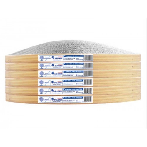 - Especificações Técnicas: :: Diâmetro da peneira: 55cm :: Malha da peneira: 2mm x 4mm (externa) / 1,3mm x 2,5mm (interna) :: Fio da peneira: Espessura: 0,30mm / Cordão: 0,30mm :: Material do aro da peneira: madeira