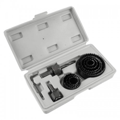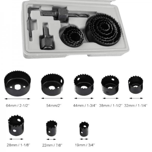 Composto por serras de diferentes diâmetros, hastes de fixação e chave allen, o kit acompanha maleta plástica para organização e transporte.