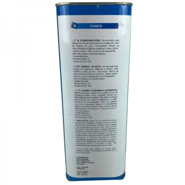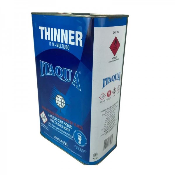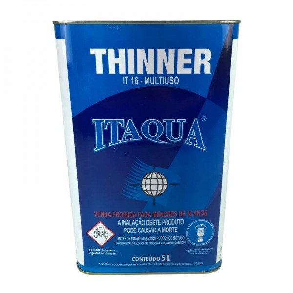 O Thinner da Itaqua é recomendado para diluição de tintas sintéticas como primers, esmaltes, tintas, resíduo de verniz, cola, e pode também ser utilizado para a limpeza em geral como em maquinas, motores e ferramentas. Thinner é um solvente e líquido inflamável, composto por mistura de hidrocarbonetos, alifáticos e aromáticos, ésteres, glicóis, cetonas e alcoóis, aditivos de desempenho e livre de benzeno e solventes clorados.